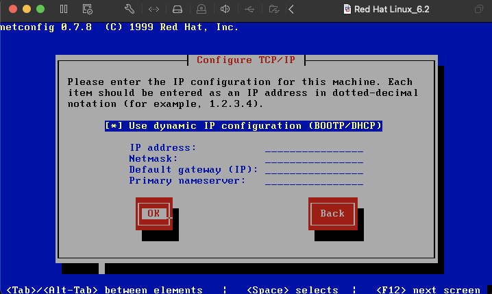 스페이스바를 눌러 Use dynamic IP configuration 항목에 체크하고, TAB 키를 이용해 OK를 누른다.
