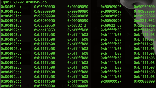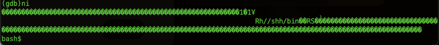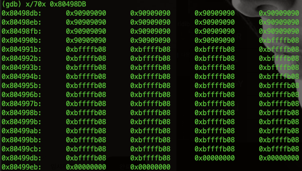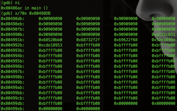 "ni" 명령으로 memcpy() 함수를 호출하고 나면 위와 같이 buffer가 가리키는 힙 공간에 있는 값이 "0x90 + shellcode + ret의 값" 형태로 된다.