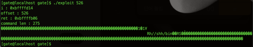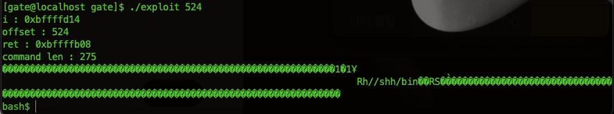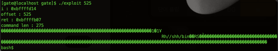 위의 사진을 참고하면 셸이 안 떨어지는 것을 보니 &i - 524의 주소가 buffer[256]의 시작 주소이지만, &i - 525의 주소도 셸이 떨어진다.