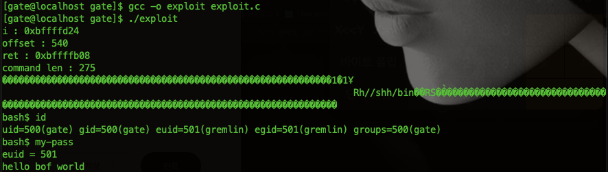 exploit.c를 컴파일하여 인자 없이 미리 정해져 있는 offset 값을 사용해 공격하면 위와 같이 셸이 떨어지고, gremlin의 패스워드를 얻을 수 있다.