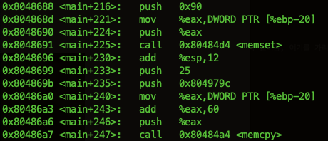 그리고 스택을 보면 memcpy() 함수의 인자가 들어가 있는데 memcpy() 함수는 3개의 인자를 받고, 현재 스택에 있는 값들 중 buffer+60에 해당하는 값은 0x08049917이며, 이 값에 60을 뺀 주소가 buffer의 주소이다.