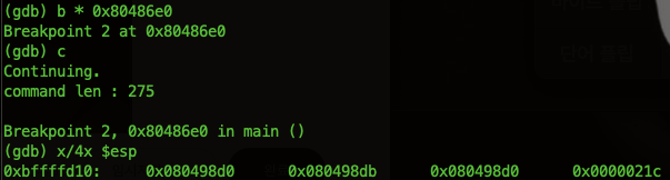 그리고 스택을 보면 command가 가리키는 주소 0x080498d0이 스택에 들어가있다.