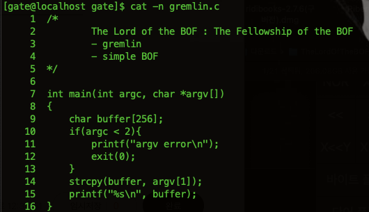 buffer의 크기는 256byte이고, 프로그램을 실행할 때 사용자가 입력값을 인자로 넘기도록 되어 있으며, 사용자가 넘긴 입력값을 그대로 buffer에 복사하고 buffer의 내용을 출력한다.