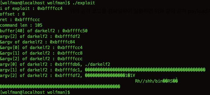 위의 사진을 참고하면 exploit.c의 변수 i의 주소가 darkelf2의 argv[2]의 주소보다 작은 주소 쪽에 가깝게 있다.