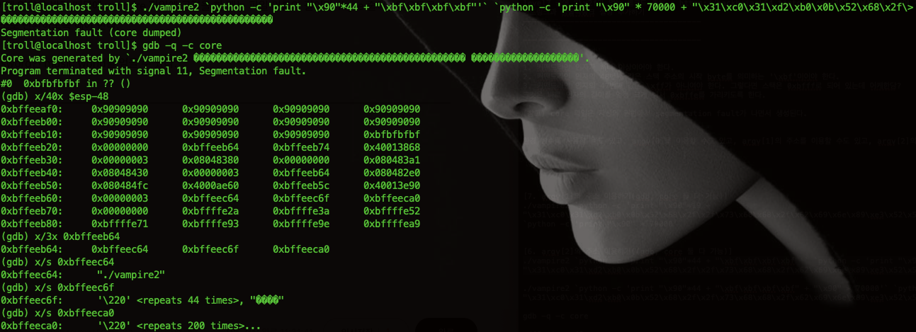 먼저 vampire2 파일의 이름을 NOP + shellcode 형태로 변경해주고, 변경된 vampire2에 테스트용 payload를 인자로 주며 실행하여 core 파일을 생성하고, core 파일을 분석해보면 argv[0]의 주소는 0xbffeebc4이다.
