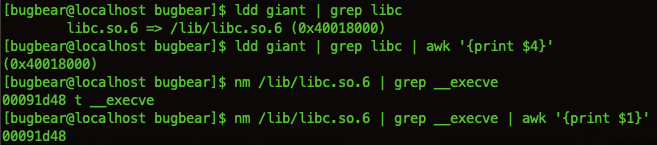 nm /lib/libc.so.6 | grep __execve | awk '{print $1}'