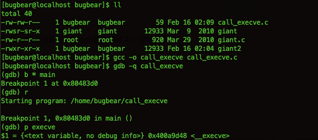 call_execve.c 파일에 위의 코드를 입력한 후 컴파일 하여 gdb로 열어 실행한 뒤 execve() 함수의 주소를 출력한다.