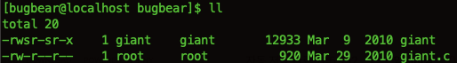 level14 문제에서는 명령어들을 사용할 때 절대경로로 입력하고 assassin 프로그램을 이용했지만, 현재 권한이 bugbear이므로 assassin 프로그램에 접근할 수 없기 때문에 giant 프로그램으로 대체하고, 명령어는 그냥 프로그램 이름만 입력하면 위와 같다.