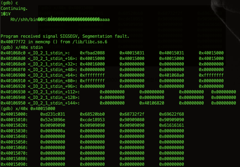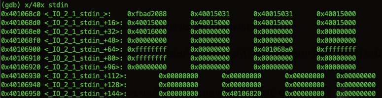 참고) x/40x 0x401068c0 대신 x/40x stdin을 입력해도 된다.