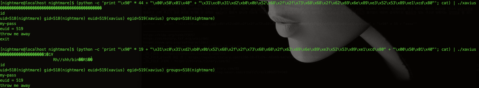 payload를 수정하여 xavius에 인자로 주며 실행하면 xavius의 password인 throw me away를 얻을 수 있다.