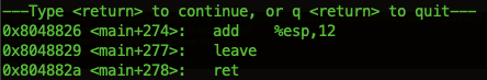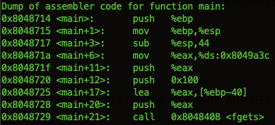 그리고 fgets() 함수를 호출하는 부분 0x8048729와 ret 명령 부분 0x804882a에 breakpoint를 걸고 test payload를 입력으로 주며 실행한다.