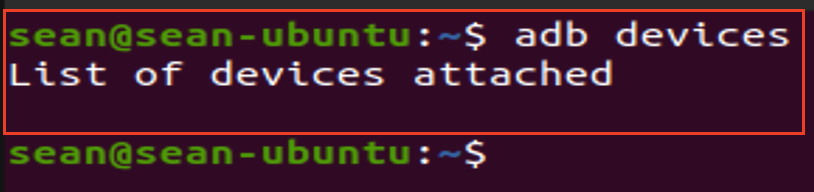 그다음 Ubuntu의 Terminal에서 아래의 사진과 같이 adb devices를 입력해줍니다.