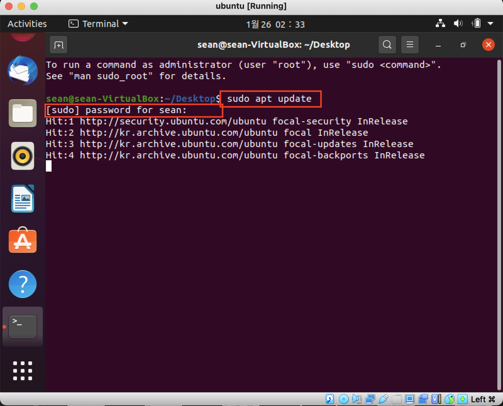먼저, sudo apt update를 입력하여 운영 체제에서 사용 가능한 패키지들과 그 버전에 대한 정보를 업데이트합니다.