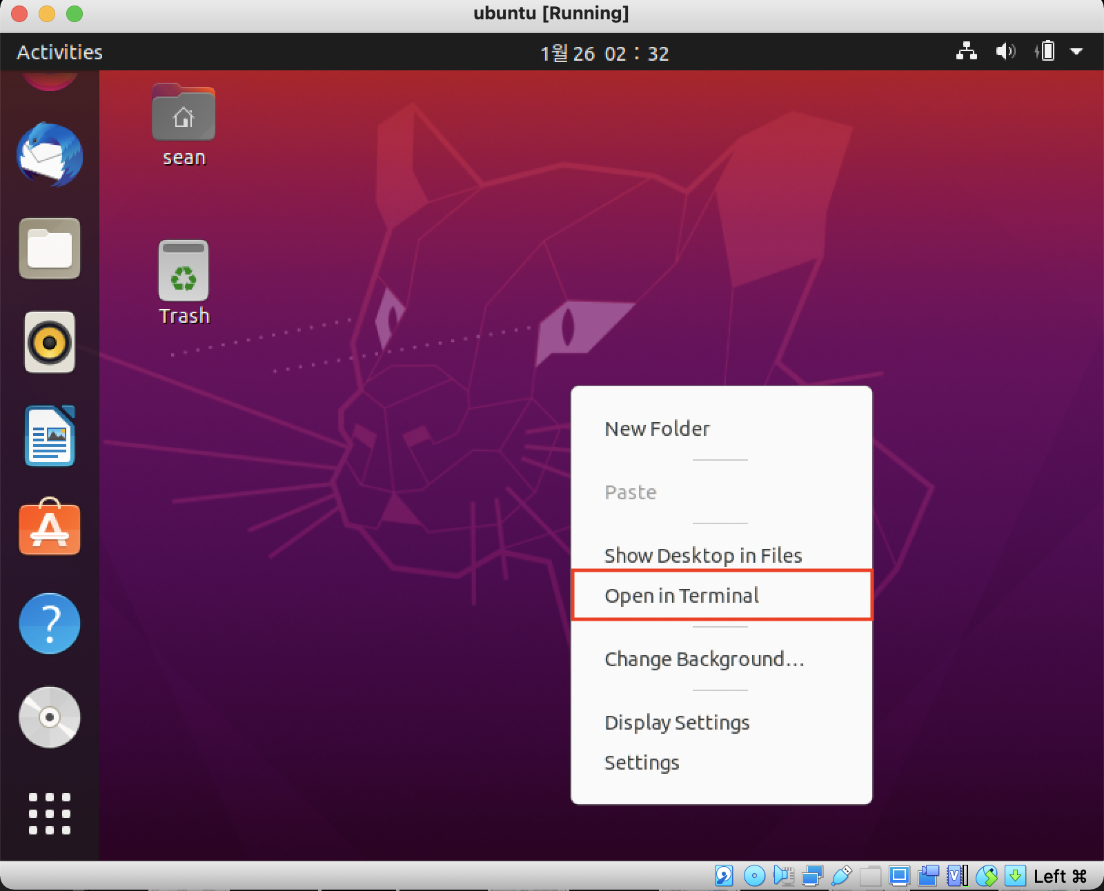 터미널은 아래의 사진처럼 바탕화면에서 마우스 우클릭을 하면 여러 메뉴들이 뜹니다.