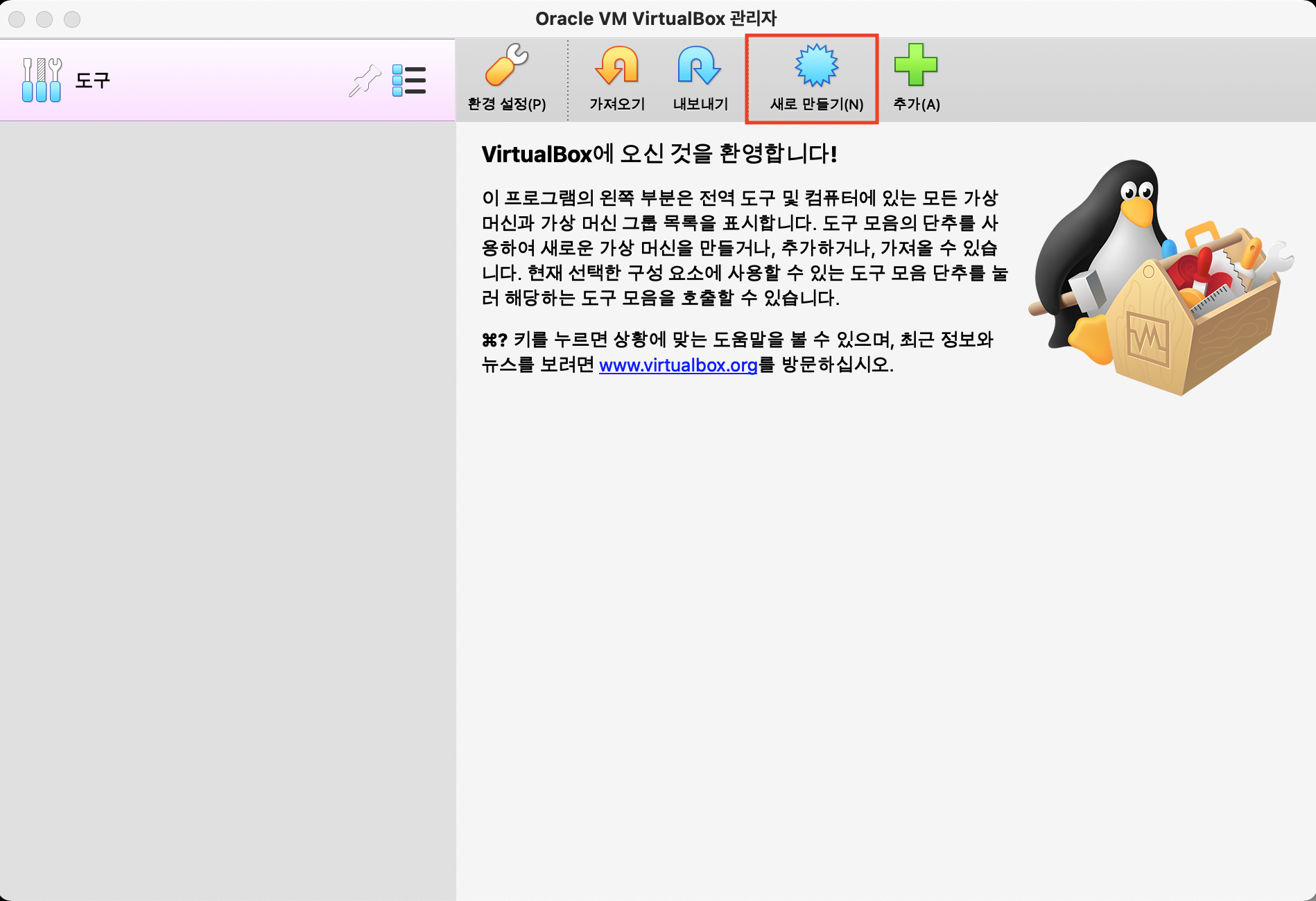 vbox를 켜면 아래의 사진과 같은 화면이 보일 것입니다.