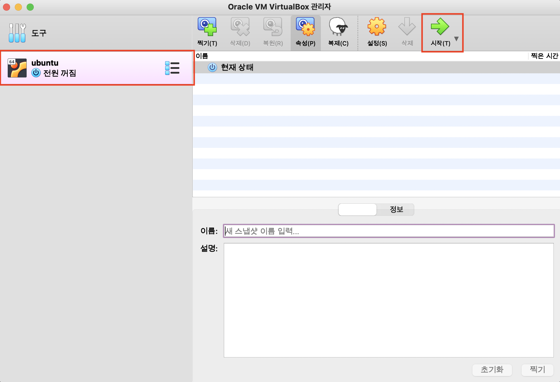 하나는 해당 가상 머신 운영 체제를 선택 후 오른쪽에 있는 빨간색 박스 부분의 시작 부분을 눌러 시작해줍니다.