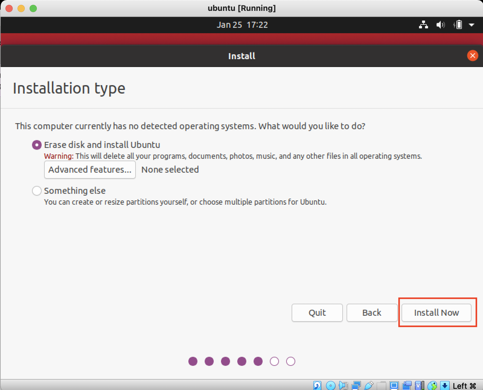 여기서는 기본적으로 설정되어 있는 Erase disk and install ubuntu를 선택한 뒤 Install now를 눌러 진행해줍니다.