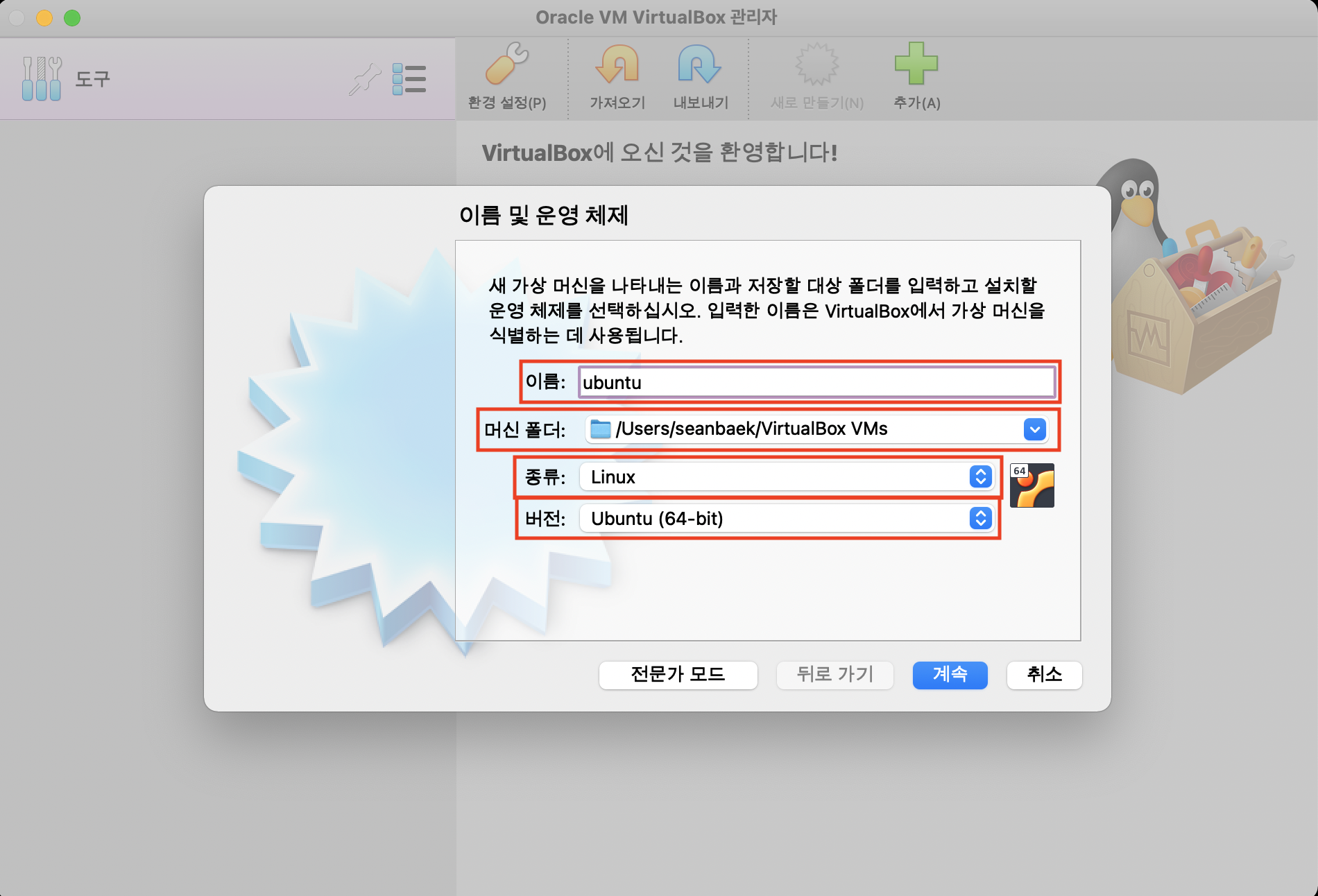 아래의 사진을 참고하여 자신의 계정과 비밀번호 그리고 운영 체제의 이름을 설정한 뒤 continue를 눌러 진행해줍니다.