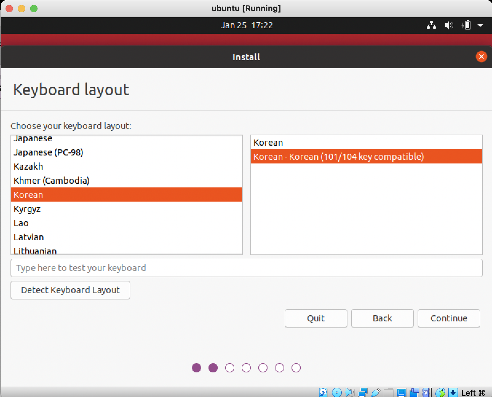 보통 한국어를 사용하기 때문에 Korean을 선택하고 101/104 키를 선택하면 됩니다.