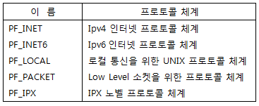 즉, socket 함수의 첫 번째 인자로 전달되는 PF_INET에 해당하는 프로토콜 체계에도