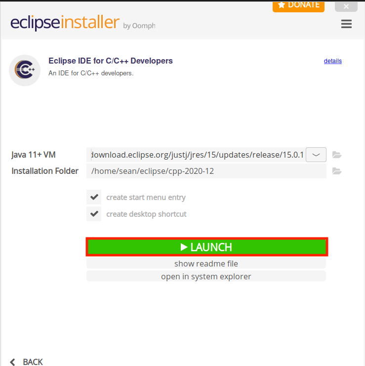 Eclipse 설치가 완료되면 아래의 사진처럼 LAUNCH 버튼이 뜰 것입니다.