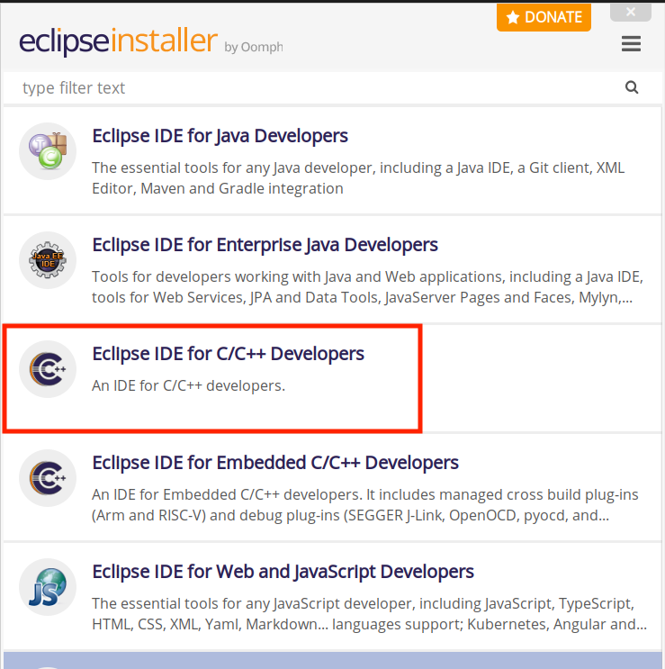 아래의 사진 속 빨간색 박스 부분에 있는 Eclipse IDE for C/C++ Developers를 눌러줍니다.