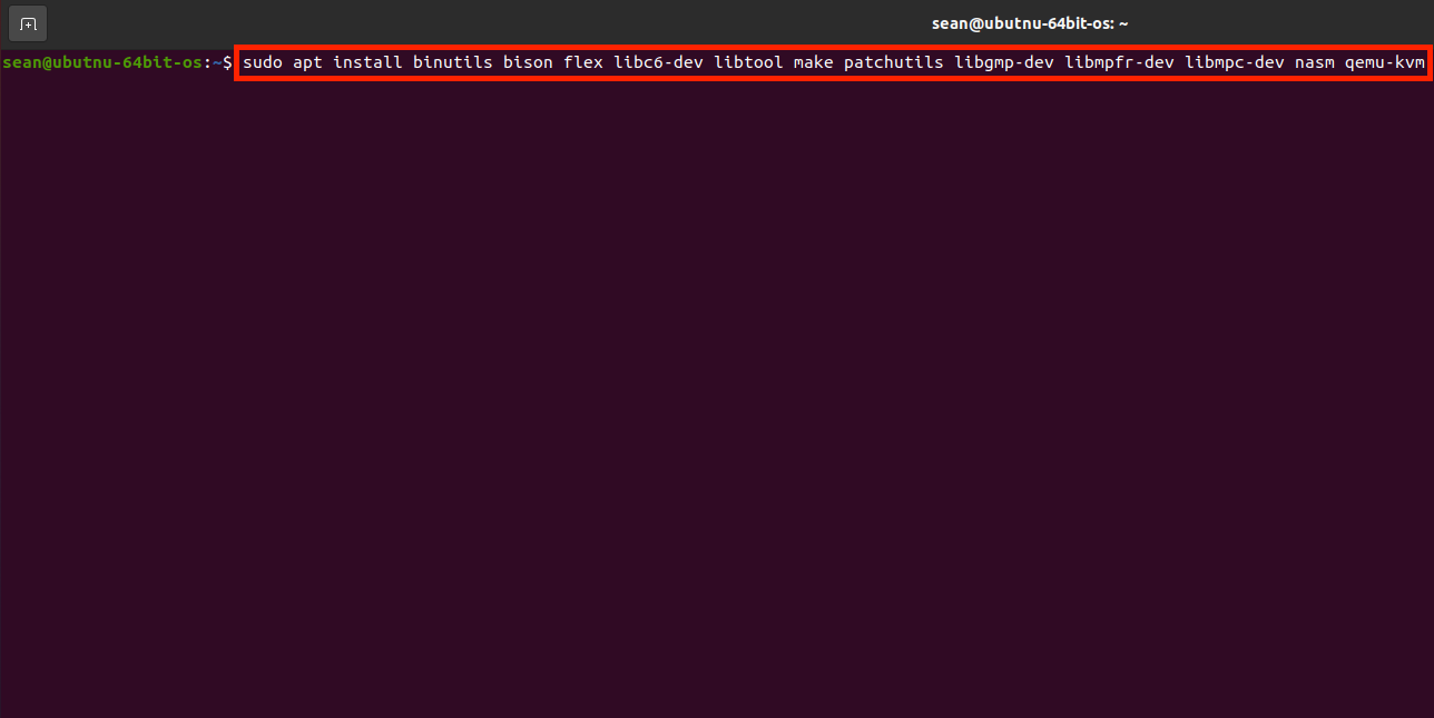 sudo apt install binutils bison flex libc6-dev libtool make patchutils libgmp-dev libmpfr-dev libmpc-dev nasm qemu-kvm