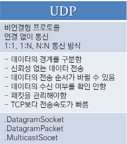 " 신뢰성과 순차적 데이터 전송을 보장하지 않는, 고속의 데이터 전송방식 소켓 "