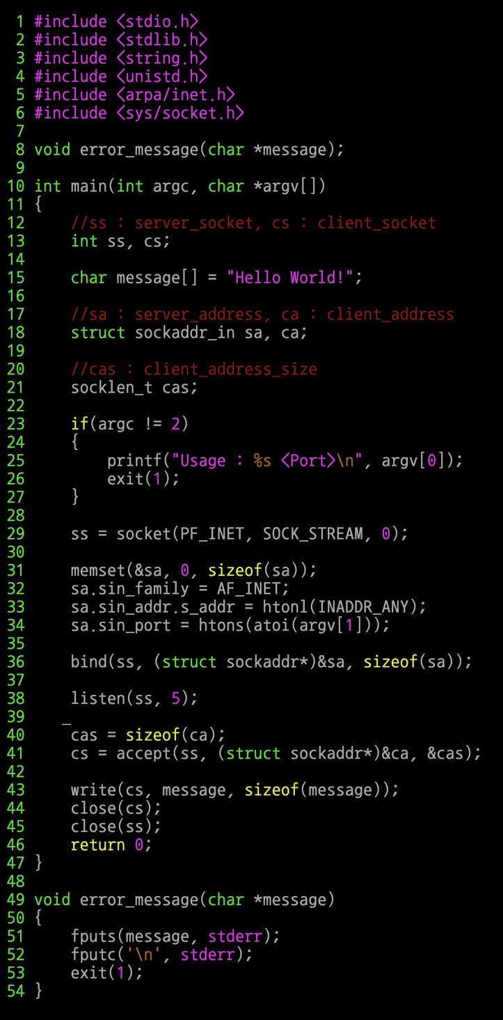 그렇다면 먼저 TCP 소켓 서버 측의 코드이다.