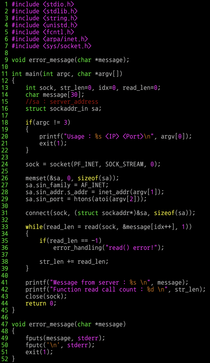 38번째 줄 : 이 문장이 실행될 때 변수 read_len에 저장되어 있는 값은 항상 1이다.