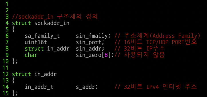 따라서 이 구조체를 사용하면 IP주소와 PORT번호를 쉽게 할당할 수 있다.