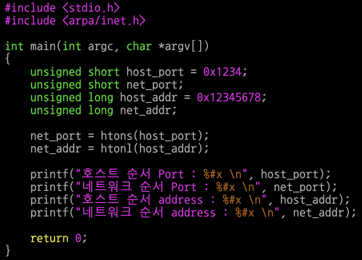 11, 12번째 줄 : 변수 host_port와 host_addr에 저장된 데이터를 네트워크 바이트 순서로 변환하고 있다.