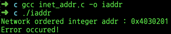 이 잘못된 주소를 이용해서 inet_addr 함수의 오류 검출능력을 15번째 줄에서 확인한다.