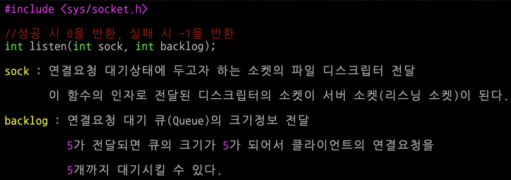 listen 함수의 첫 번째 인자로 전달된 파일 디스크립터의 소켓이 어떤 용도로 사용되는지 알 수 있다.