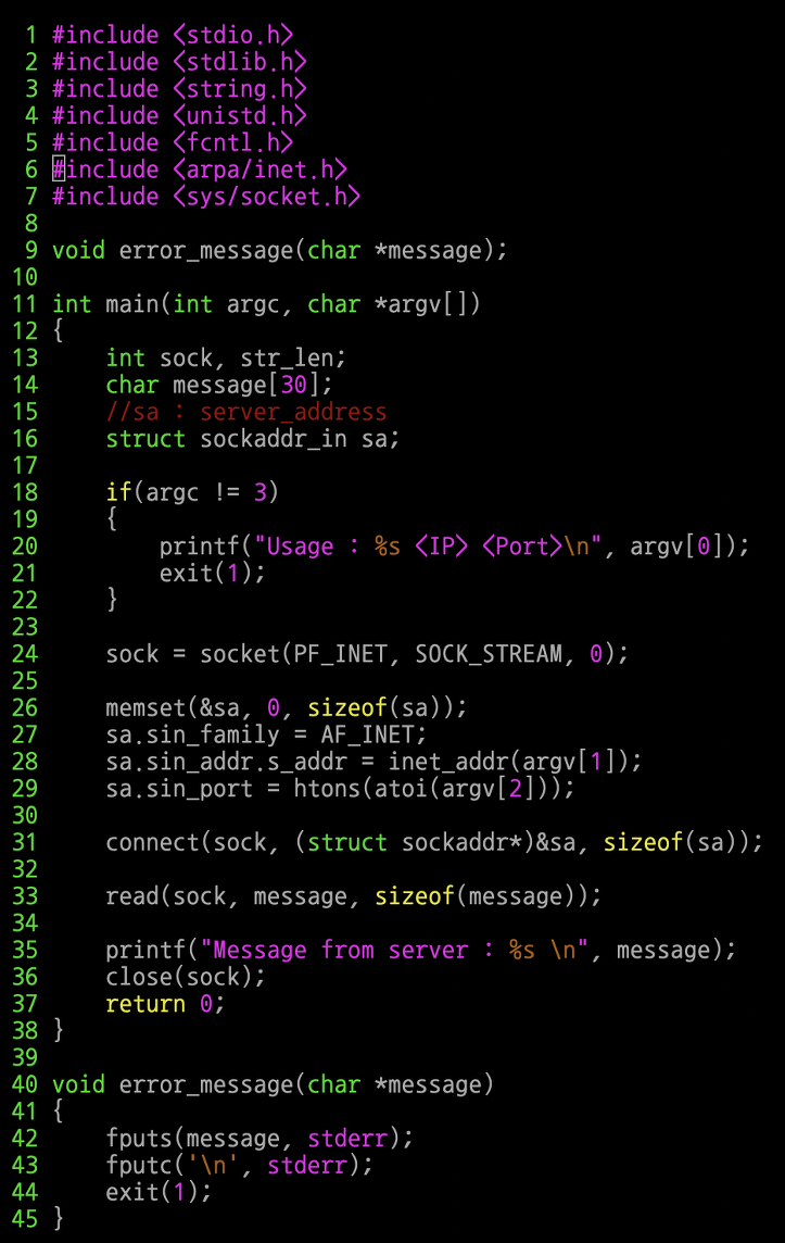 26 ~ 29 행 : 구조체 변수 serv_addr에 IP와 PORT번호 정보를 할당하여 초기화한다.